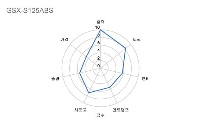 GSX-R 125와 엔진을 공유하고 있어 GSX-R 125와 마찬가지로 125cc 모터사이클 라인업에서 가장 높은 출력을 탑재했다. 포지션은 좀 더 편안하고 직관적인 네이키드 스타일을 갖춘 만큼 입문자로선 비교적 쉽고 편안하게 적응할 수 있는 바이크다. 출력이 높다고 연비가 낮다는 편견은 이제 옛날얘기다. 리터당 41.22km의 연비 효율을 자랑한다. 연료 탱크가 11L니까 단순 계산해보면 1회 주유에 453km, 즉 1회 주유로 서울에서 부산까지 한 번에 갈 수 있다는 결론이 나온다. R 모델에 적용된 키리스 스마트키가 옵션에서 빠진 대신 비교적 저렴한 가격에 출시되었다.