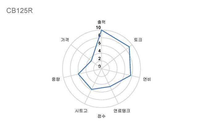 혼다는 ‘네오 스포츠 카페’라는 슬로건과 함께 CB 시리즈를 출시하고 있다. 어딘가 레트로한 구석이 있으면서도 전체적으로는 현대적인 외관을 하고 있다. 최고출력은 10,000rpm에서 15.0ps로 단기통 125cc 엔진에서는 상대적으로 높은 가용 rpm과 출력을 자랑한다. 여기에 125cc 모터사이클의 장점인 연비까지 챙겼다. 정속주행 시 54km/l의 연비로 10,000rpm 이상을 사용하는 네이키드 바이크임을 고려한다면 효율적인 연료 소비다. 시트고 815mm에 전후 17인치 타이어 세팅은 CB125R이 본격적인 라이딩을 위한 모터사이클임을 반증한다. 125cc 클래스에서는 좀처럼 찾아보기 힘든 관성측정장치(IMU)가 적용되어 있다.