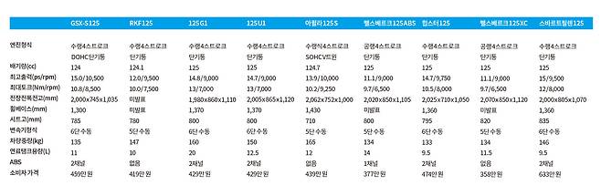 미국 원주민들 사이에 전해져 오는 말 중에 ‘안장에 익숙해졌을 때, 비로소 자유를 느낄 수 있다.’라는 말이 있다. 바이크도 마찬가지라고 생각한다. 배기량이 크면 클수록 타는 법을 익히고 조작에 익숙해지는 데 시간이 오래 걸리기 때문에 타는 즐거움에 집중하지 못할 수 있다. 주행이 익숙해지고 나면 출력에 부족함을 느낄 수 있는데, 그건 그때 가서 고민할 일이다. 입문으로 탔던 125cc 모터사이클로부터 새로운 종류의 자유로움과 설렘으로 가득한 추억을 얻었다. 나에게 꼭 맞는 125cc 모터사이클을 선택하는 것부터가 그 즐거운 추억의 시작이다. 모터사이클이 익숙한 라이더는 낮은 시트고에서 오히려 자세와 시야 측면에서 불편함을 느낄 테지만 이번 기획은 입문자들을 위한 125cc 모터사이클 소개이기 때문에 입문자의 눈높이에 맞췄다. 시작하는 단계에서는 발이 잘 닿고, 무게가 가벼운 편이 다루기 쉽기 때문에 높은 점수를 주었다. 최대출력과 토크, 연비, 연료탱크의 용량 점수는 해당 항목에서 동급 중 가장 수치가 높은 바이크를 기준으로 백분위 비율로 점수를 매겼다. 시트고와 중량, 가격은 표준편차를 고려하여 점수를 매겼다.