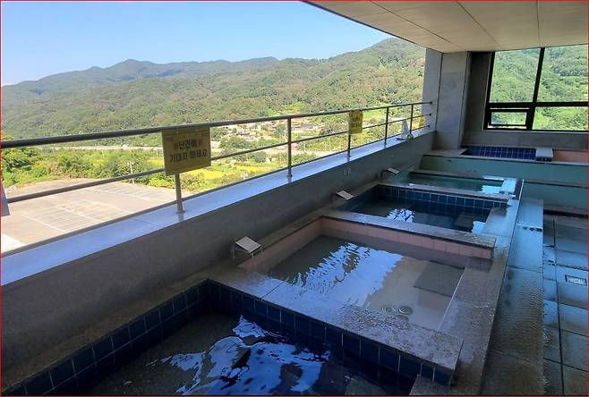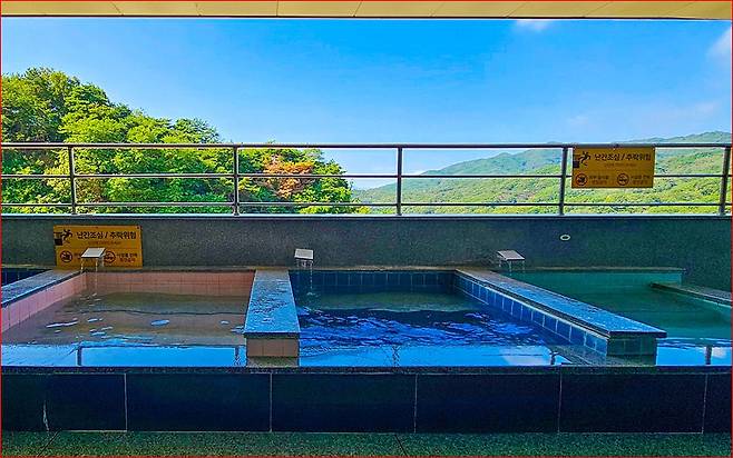 특히 기억에 남는 공간은 노천탕입니다. 건물 뒤편으로 이어진 야외 탕에서 유학산 자락을 바라보며 온천을 즐길 수 있는데, 차가운 겨울 공기와 따뜻한 물의 대비가 이곳의 백미입니다. 노천탕은 총 8개의 탕으로 구성되어 있으며, 동절기에는 오후 5시까지 운영됩니다.