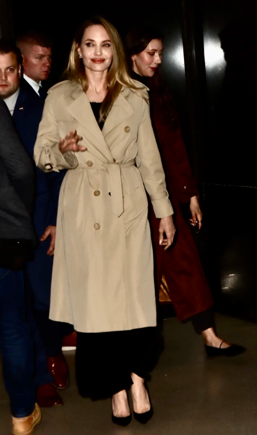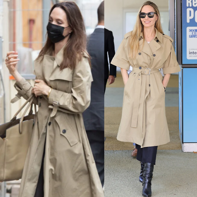 안젤리나 졸리는 트렌치코트를 활용한 세련된 스타일링을 선보였어요. 차분한 컬러감의 트렌치코트에 블랙 미디스커트를 매치해 안정감 있는 조합을 완성했죠. 특히 눈에 띄는 것은 반소매 트렌치코트였어요. 소매가 짧게 컷팅된 디자인이 클래식한 분위기를 유지하면서도 색다른 포인트가 되어 주었죠.