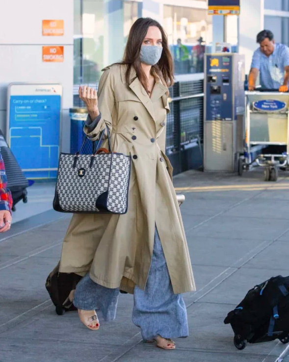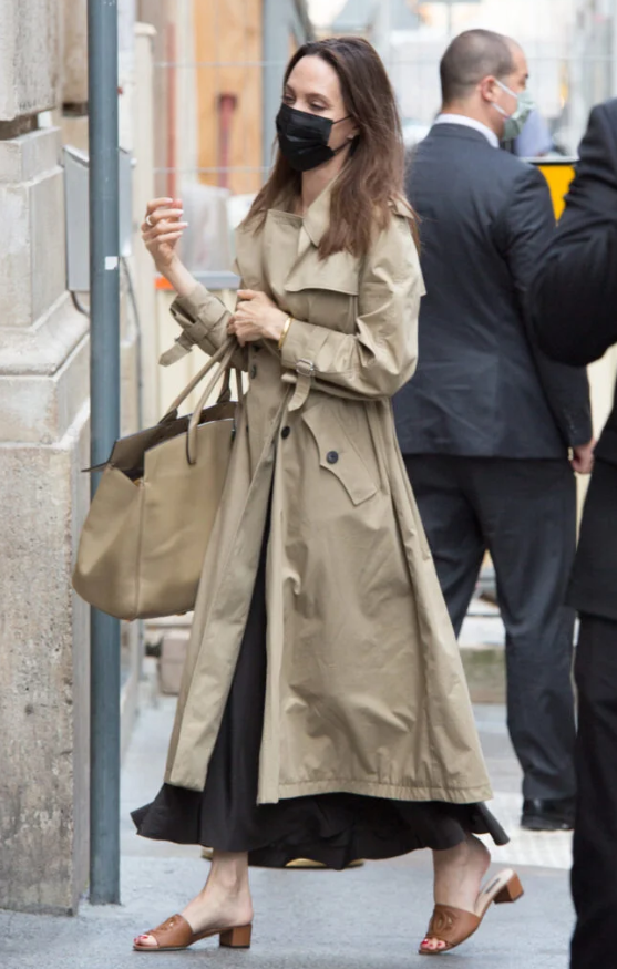 안젤리나 졸리는 트렌치코트를 활용한 세련된 스타일링을 선보였어요. 차분한 컬러감의 트렌치코트에 페미닌한 플레어 롱스커트로 우아한 무드를 완성했죠. 가방은 톤온톤으로 코트와 자연스럽게 어우러졌는데요. 신발은 브라운 뮬구두로 가볍고 멋스러웠죠.