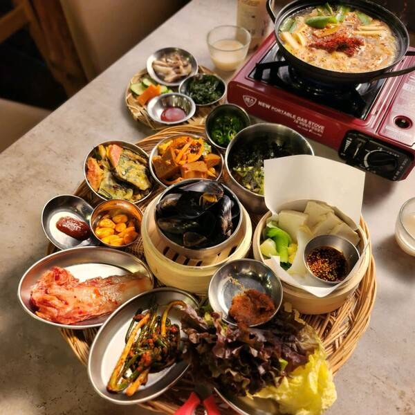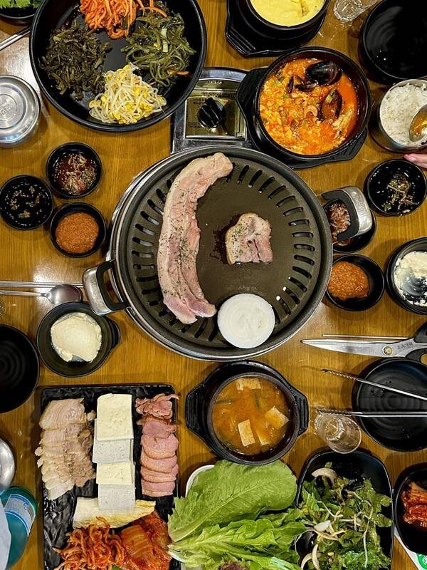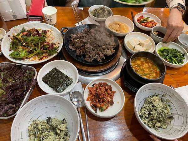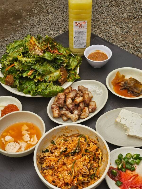 야외에도 좌석이 마련되어 있어 날씨 좋은 날이면 광교산자락에서 불어오는 바람을 맞으며 든든하게 배를 채울 수 있습니다. 칼칼한 어묵탕과 직접 만든 김치와 두부 등 밑반찬이 푸짐하게 한 상 차려지는 것이 특징인데요. 보리밥을 양념에 비벼 통통하고 촉촉한 숯불바베큐와 함께 한 입에 넣고 즐기기 좋죠.