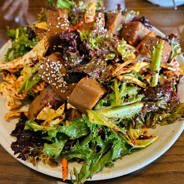 두부한정식에는 두부 뿐 아니라 보쌈과 훈제오리가 제공되는데요. 쌈밥 전문점인만큼 '쌈 채소'를 무한으로 리필되는 점이 특히 매력적입니다. 참기름과 고추장이 한 켠에 준비되어 있으며 나물이 큰 대접 그릇에 담겨 나오니 공기밥을 덜어 비빔밥을 만들어 다채로운 음식을 즐겨보기에도 좋습니다.