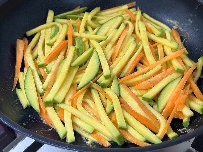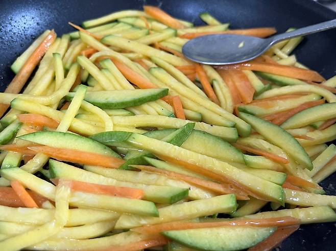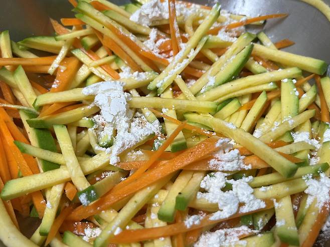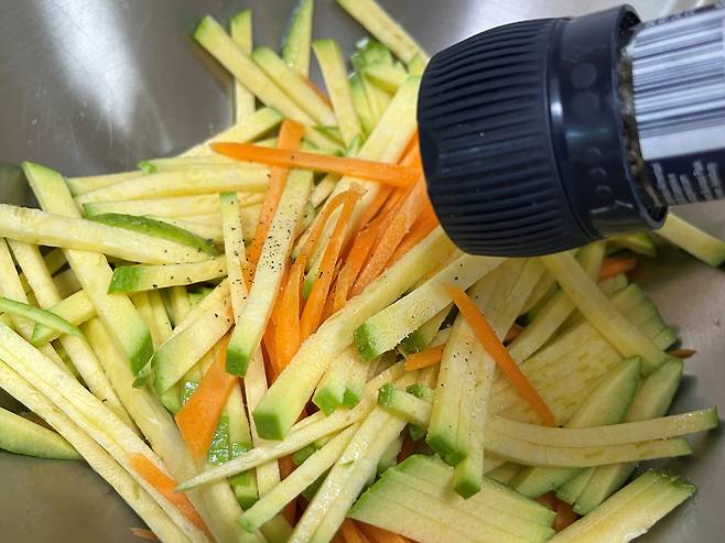 채 썬 호박과 당근에 소금, 후추로 밑간을 하세요.