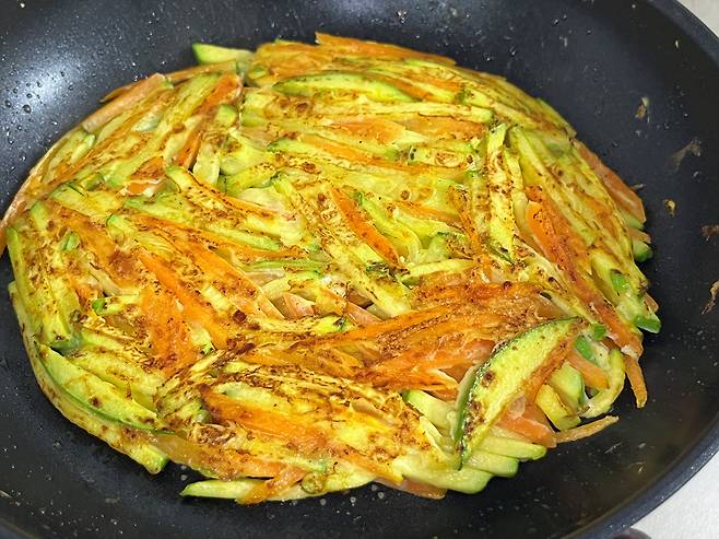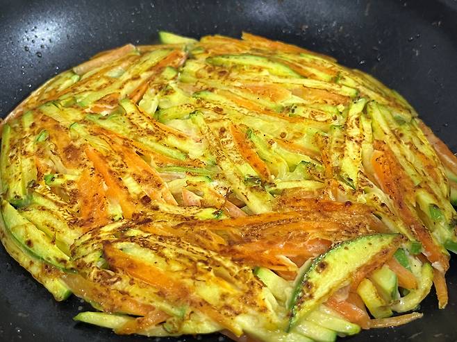 양쪽 면이 노릇하게 구워졌고 호박도 달큼하게 익었습니다. 이렇게 호박 부침개를 만들면 간식으로도, 밥반찬으로도 얼마든지 즐겨 드실 수 있습니다.