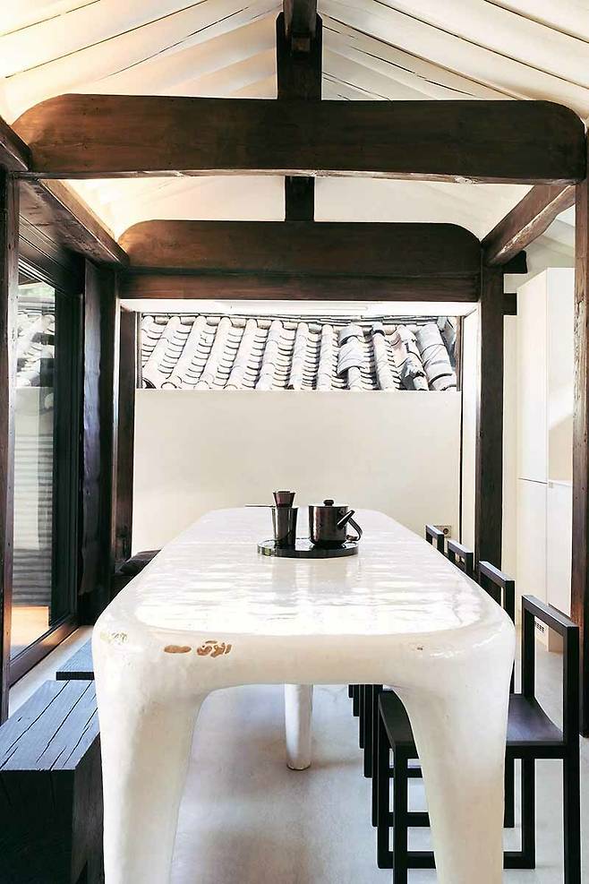 위엄이 느껴지는 블루재와는 달리 위채와 아래채로 구성된 힐로재는 우아하면서도 모던한 분위기가 물씬 풍겨요. 허명욱 작가의 옻칠 벤치와 이헌정 작가의 세라믹 다이닝 테이블 등 내로라하는 국내 작가들의 아트 퍼니처를 배치한 점이 특징. 한옥에 어울리는 소품과 가구 디테일, 작품 선정에 많은 시간을 할애했다는 박현구 대표의 말이 다시금 되살아났습니다.