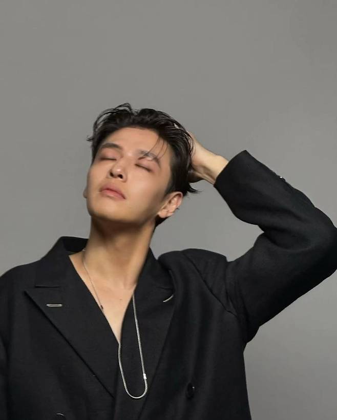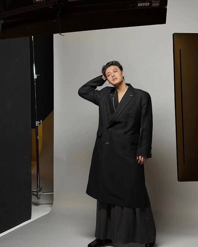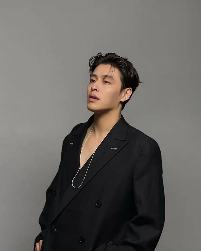 전체적으로 블랙 톤을 유지하면서 소재의 질감 차이로 깊이감을 준 것이 인상적이다. 재킷은 구조적인 어깨 라인과 긴 기장으로 묵직한 존재감을 자아내며, 팬츠는 은은한 스트라이프 패턴과 함께 부드러운 흐름을 연출해 포멀하면서도 자유로운 감성을 담아냈다. 버튼 디테일과 포켓 디자인은 클래식한 무드를 살리면서, 강하늘 특유의 부드러운 표정과 조화를 이루며 세련된 이미지를 극대화했다.