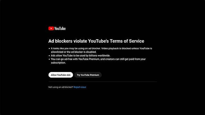 유튜브의 차단에 걸리면 ‘유튜브의 광고 차단기가 비활성돼 있지 않으면 동영상 재생이 차단됩니다’라는 알림이 표시된다. 여기에는 ‘광고를 허용하거나 유튜브 프리미엄을 사용해 보라’는 메시지가 포함돼 있다.