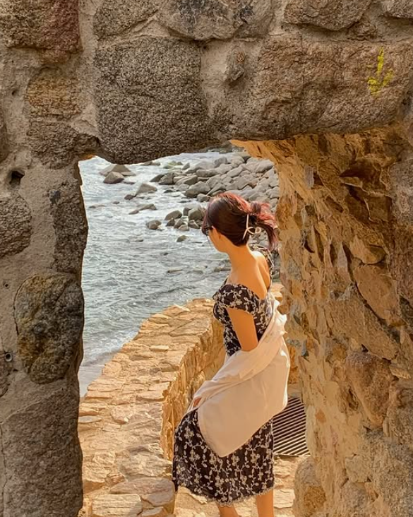 원피스는 진한 네이비 컬러 위에 은은한 꽃무늬가 더해져 차분하면서도 여성스러운 분위기를 연출해 줬는데요. 전체적인 핏은 몸에 너무 달라붙지 않아서 내추럴한 느낌이 있었고, 슬기 님의 부드러운 이미지와도 아주 잘 어울렸답니다.