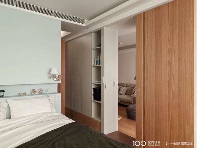 거실과 침실 양쪽에서 접근 가능한 욕실은 순환식 구조로 편리함을 더했다. 화장실 문 앞 하단에 센서등을 설치해 밤에도 무리 없이 이동 가능하고, 침대 헤드 뒤 수납장은 드레스룸과 침실을 자연스럽게 나누며 수납까지 해결했다.