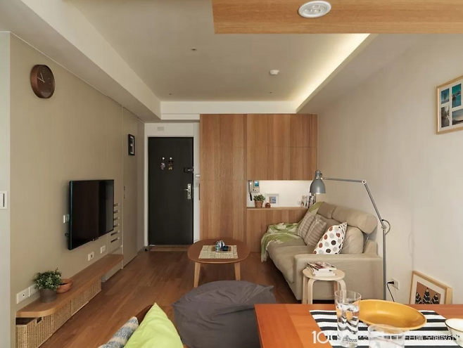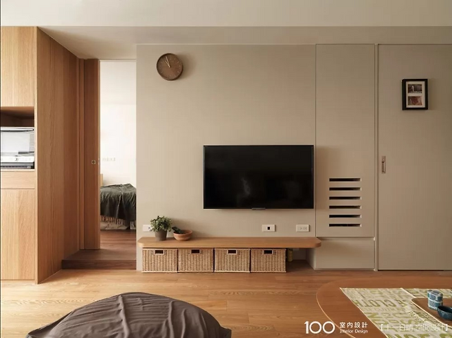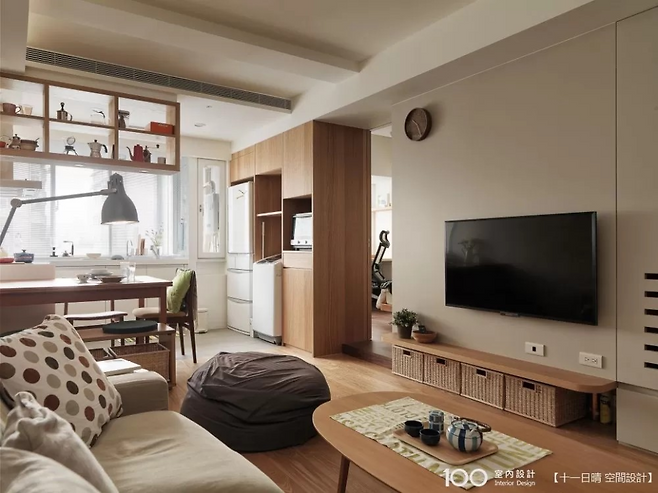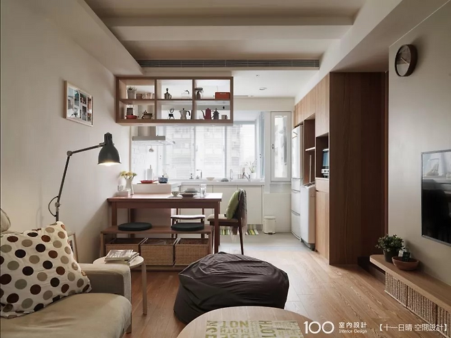 거실과 침실 사이의 TV 벽은 양면 수납이 가능한 구조다. 벽체 하단은 오픈해 바구니 수납이 가능하고, 위쪽은 둥근 선반 처리로 안전성까지 챙겼다. 수납과 공간 분리를 모두 만족시킨, 소형 아파트에 딱 맞는 효율적 아이디어다.
