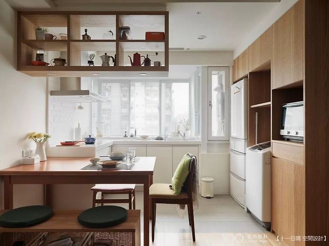 상부장을 과감히 생략하고 가전제품을 한쪽 벽에 몰아 배치하면서 채광이 확실히 확보됐다. 오픈형 선반은 시야를 막지 않아 주방이 더 넓어 보이고, 식탁 위에 배치된 간이 선반은 조리 공간과 거실 공간을 자연스럽게 분리해준다.
