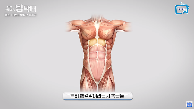 코어 근육이란, 눈에 보이지 않고 몸속에 있는 근육, 특히 횡격막, 복근, 골반의 기저에 있는 근육들, 그리고 척추 뒤쪽에서 척추의 자세를 유지해주는 근육들을 말합니다.