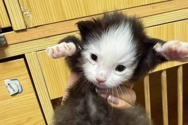이 아기 고양이는 손과 발이 하얗지만 전체적으로 검은색 외투를 입은 것 같습니다. 그런데 희한하게도 얼굴은 온통 하얗습니다.