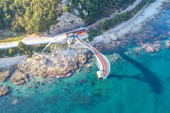 청사포다릿돌전망대의 가장 큰 매력은 바다 위로 약 72.5m를 쭉 뻗어나간 구조와 끝부분의 투명한 강화유리 바닥입니다. 사진으로 대충 흟어봐도 아찔한데요.