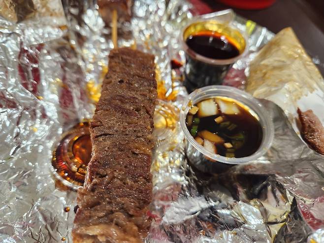 와규를 아주 얇게 사서 수십장 쌓아서 꼬지에 꼽고 네모나게 자른듯해서