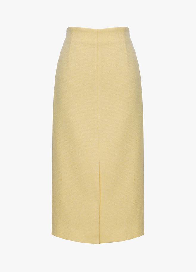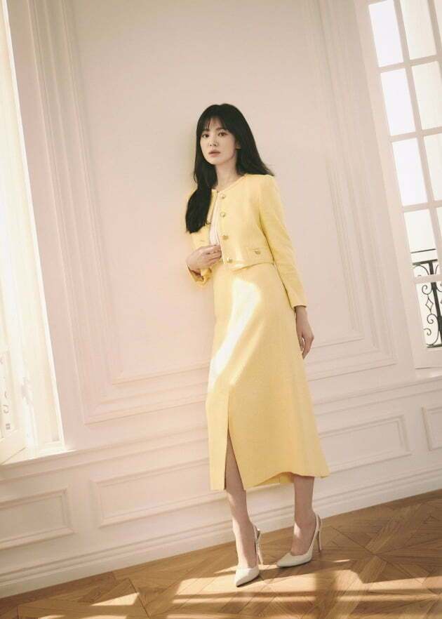 송혜교는 자켓과 스커트 모두 같은 파스텔 옐로 컬러로 매치해 룩 전체적으로 통일감을 주어 고급스러우면서 상큼하게 스타일링했다.