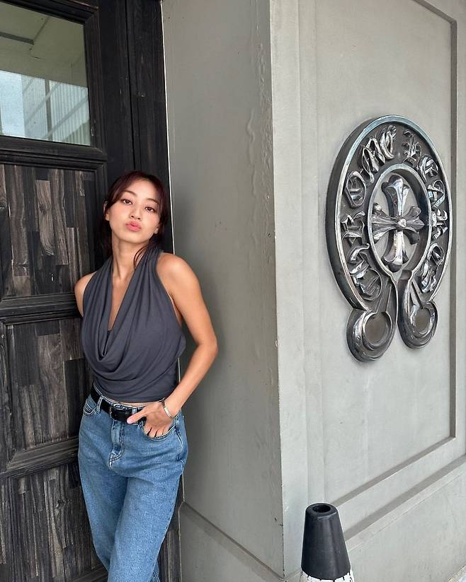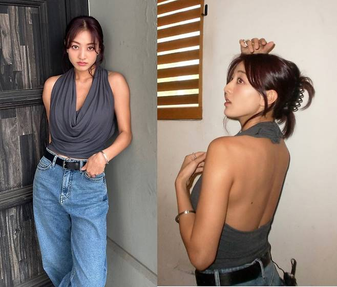 사진 속 지효는 그레이 백리스 톱을 착용해 어깨와 등 라인을 자연스럽게 드러내며 시크한 분위기를 연출했습니다. 여기에 와이드 핏의 청바지를 매치해 편안하면서도 세련된 캐주얼룩을 완성했습니다. 올림머리 헤어스타일을 더해 건강하고 자신감 넘치는 매력을 한층 돋보이게 했습니다.