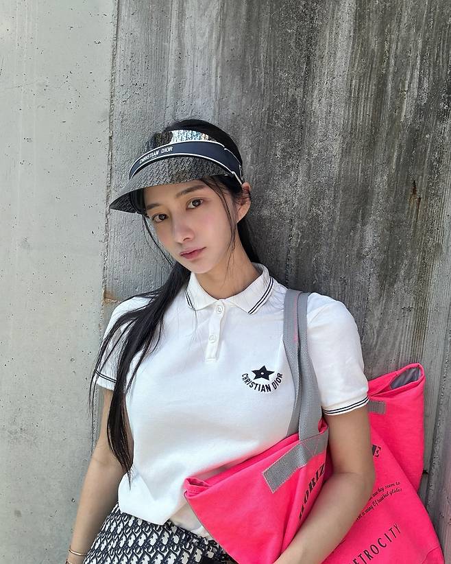 최연청은 디올 바이저와 화이트 폴로셔츠를 매치해 세련된 스포티 룩을 연출하고 있다. 특히 Christian Dior 로고가 새겨진 폴로셔츠는 클래식한 매력을 더하며, 디올 시그니처 패턴의 바이저는 고급스러운 포인트를 제공한다. 핑크 컬러의 쇼핑백이 전체적인 코디에 생동감을 불어넣고 있다.