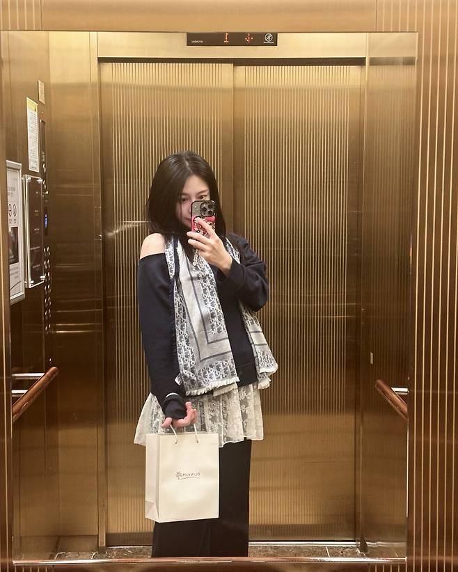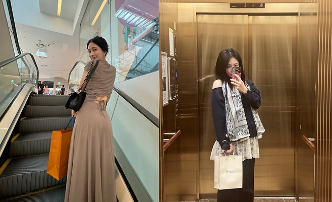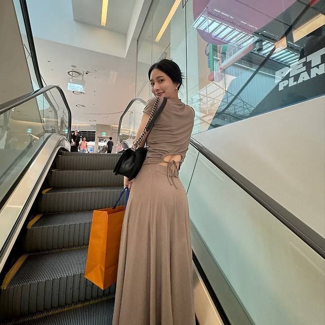 쇼핑몰에서 포착된 최연청은 베이지 톤의 터틀넥 원피스로 단아한 매력을 발산하고 있다. 허리 라인을 강조한 실루엣이 여성스러운 곡선미를 드러내며, 체인 백과 오렌지 쇼핑백의 조화가 세련된 감각을 보여준다. 차분한 컬러 톤으로 고급스러운 분위기를 완성했다.