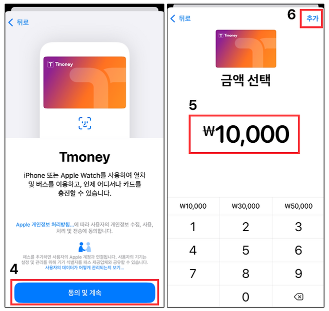 아무튼 다시 티머니 등록으로 돌아와 티머니 교통 카드를 선택하면 동의 화면이 나오게 된다. '동의 및 계속'을 터치하면 금액 충전 화면으로 가게 되는데 최소 3,000원부터 최대 90,000원까지 충전이 가능하다. 원하는 금액을 정하고 우측 상단에 있는 추가 버튼을 누르면 거의 다 온 것이나 마찬가지다.