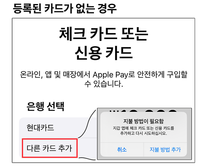 추가 버튼을 눌렀을 때 두 가지 경우로 나뉜다. 충전이 되는 경우와 충전이 안 되는 경우로 말이다. 애플 지갑 앱에서 티머니 교통 카드를 충전하기 위해서는 애플페이에 등록된 현대 카드가 필요하기 때문에 현대카드가 없다면 충전을 할 수 없다.