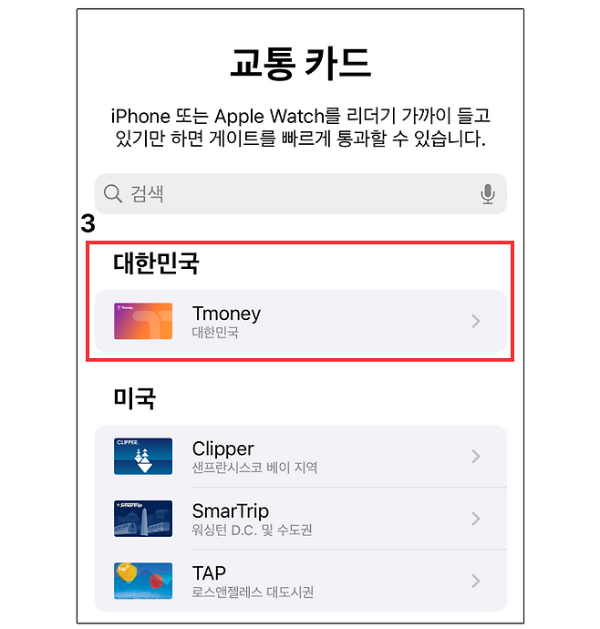 교통 카드 목록으로 들어가면 애플이 지원하는 전 세계의 온갖 교통 카드가 전시되어 있는데 맨 위 상단에서 대한민국의 티머니를 쉽게 발견할 수 있다. 참고로 티머니만 등록할 수 있고 기후동행카드나 K-패스 기반 교통 카드는 아직 지원하지 않는다.
