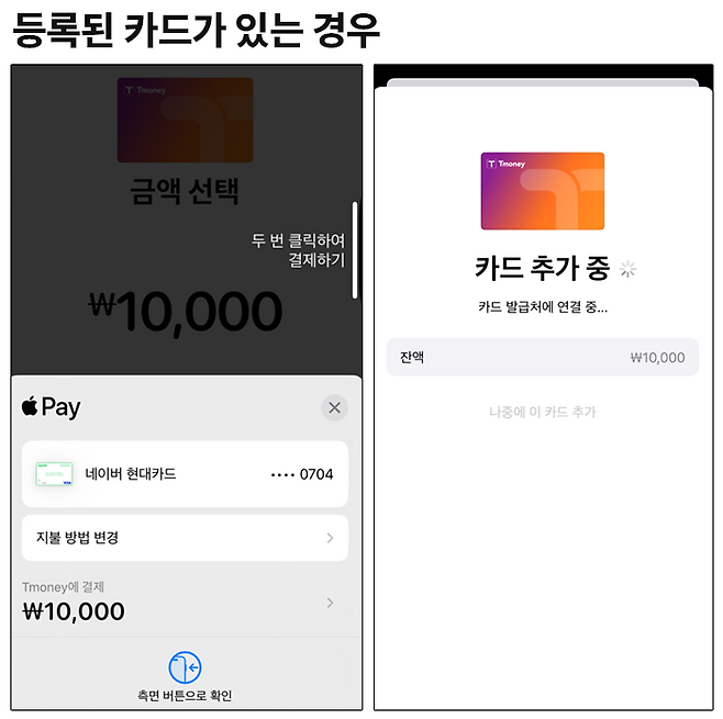현대카드가 있다면 '측면 잠금' 버튼을 두 번 눌러보자. 그럼 카드 추가 화면으로 넘어가게 되고 조금 시간이 지나면 티머니 교통카드 충전이 완료된다.