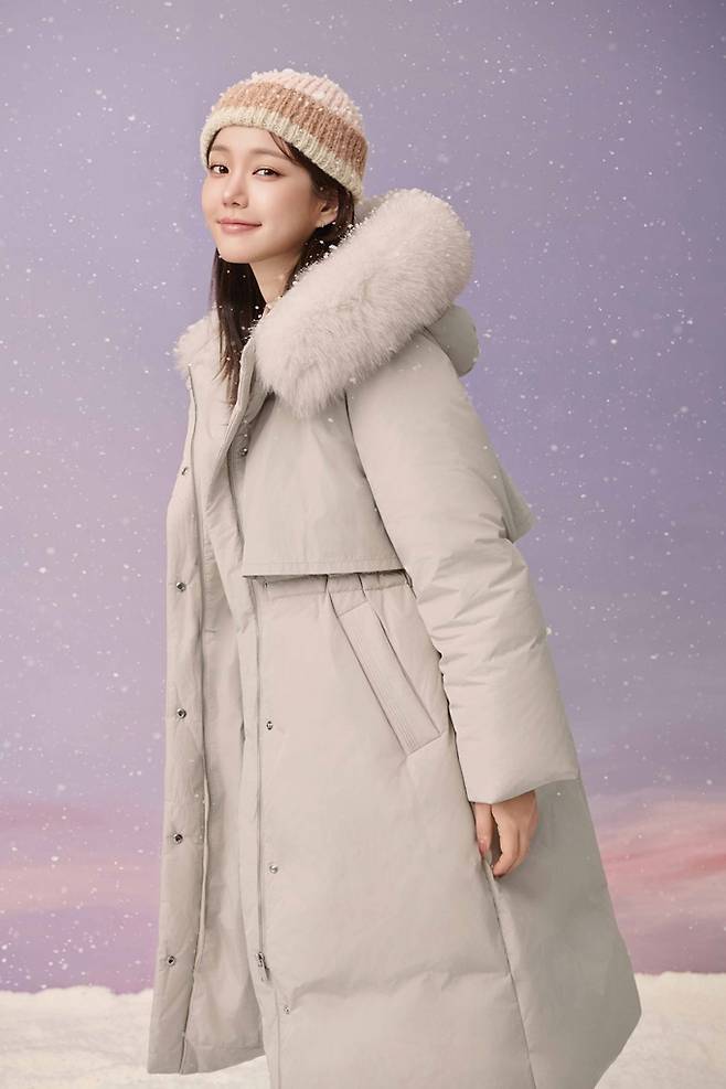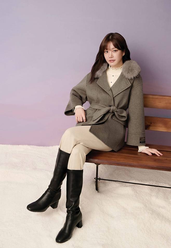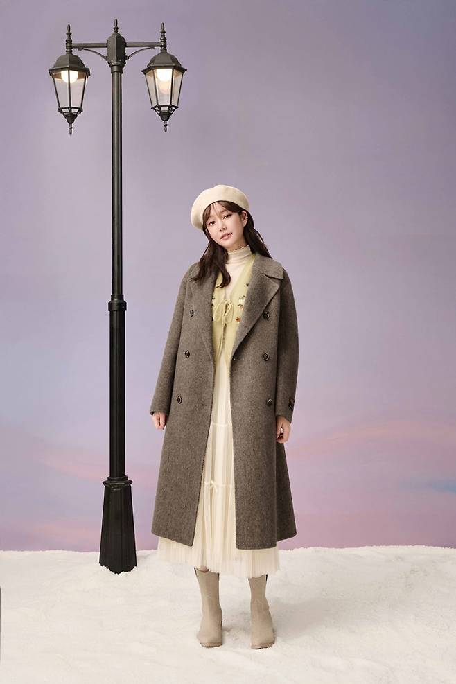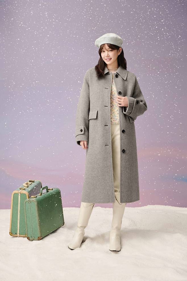 또 멜란지 그레이 컬러의 스탠카라 롱코트에 보카시 원단의 컬러 니트와 아이보리 팬츠, 베레모를 매치해 부드럽고 감성적인 겨울 롱코트룩을 선보였다.
