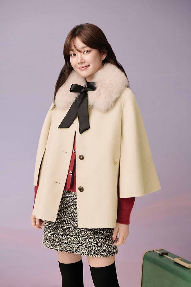 마지막으로는 아이보리 컬러의 케이프 퍼 코트에 레드 컬러의 리본 니트와 트위드 미니 스커트를 매치해 연말 분위기 가득한 홀리데이 크리스마스룩을 완성했다.