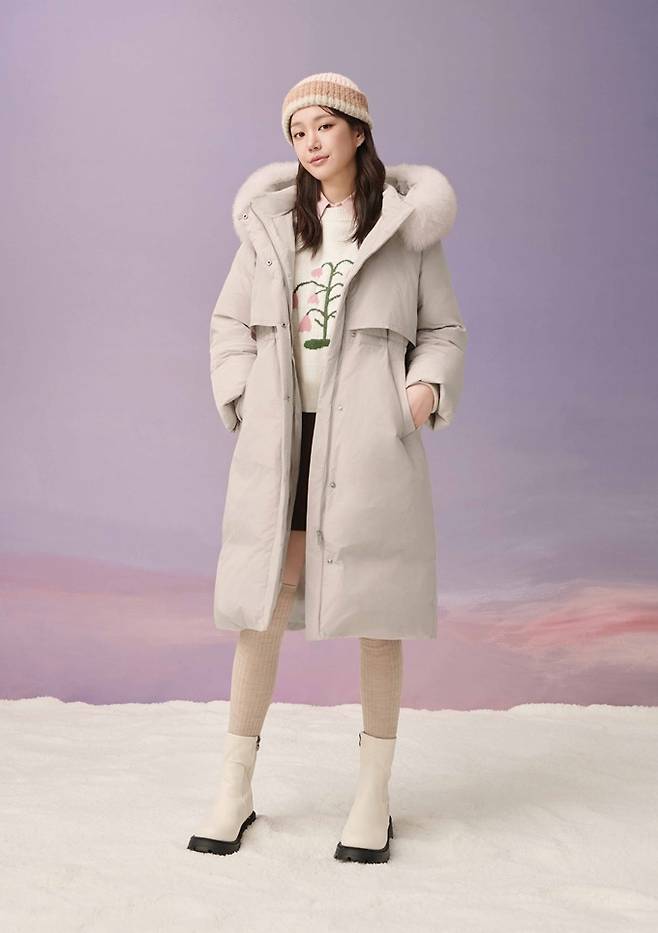 허리선 스트링 포인트로 실루엣을 살린 라이트 베이지 컬러의 롱다운 패딩에 아이보리 니트와 미니 스커트를 매치해 세련된 아웃핏을 연출했다.