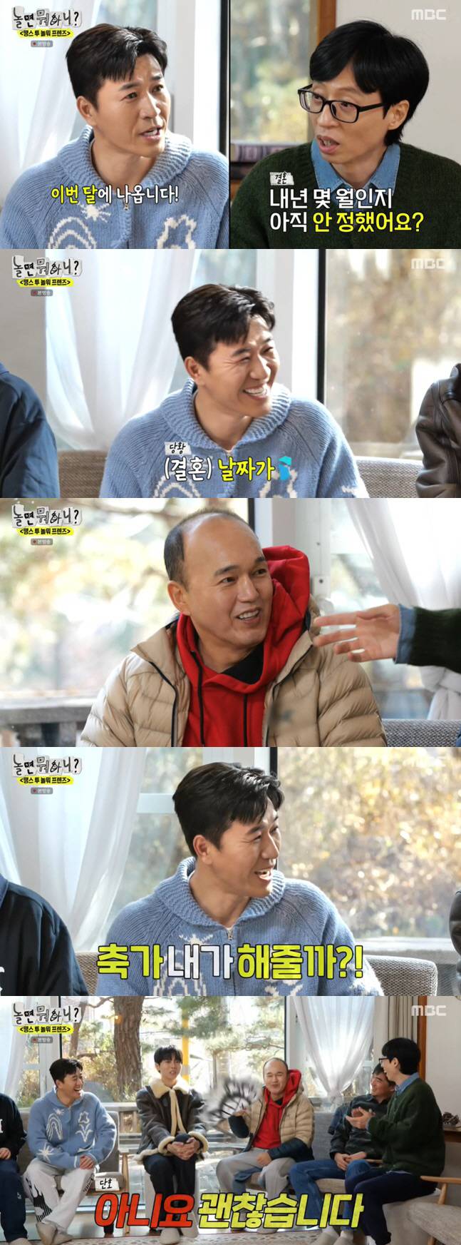 이어 유재석은 "종민이가 좋은 일이 있었다"라면서 내년 결혼 예정인 김종민을 축하해줬다. 그러면서 "내년 몇 월인지 아직 안 정해졌냐"라며 김종민의 결혼 일정에 대해 질문했고, 이에 김종민은 "이번달에 날짜가 나온다"고 밝혔다.