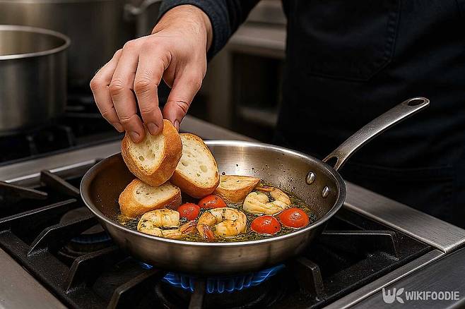 바질오일큐브 4개, 마늘 10쪽, 칵테일새우 5마리, 방울토마토 5개, 페퍼론치노 5개, 바게트, 소금, 후추