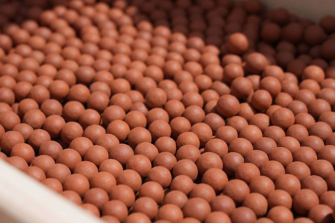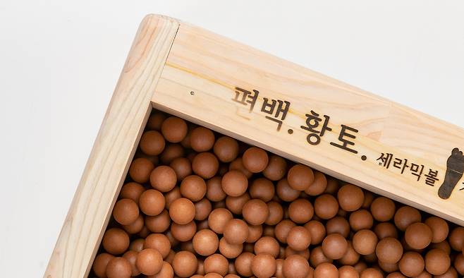 황토 세라믹볼은 콩알 만한 크기로 강도가 높아서 발바닥 지압에 효과적입니다. 황토를 파쇄한 다음 동그란 구 형태로 성형을 합니다. 자연에서 건조한 후 1000도 이상 고온에서 구워냅니다. 고온과 고압을 견뎌낼수록 볼의 강도가 높아지고, 표면이 매끈해져 가루가 묻어나지 않습니다.