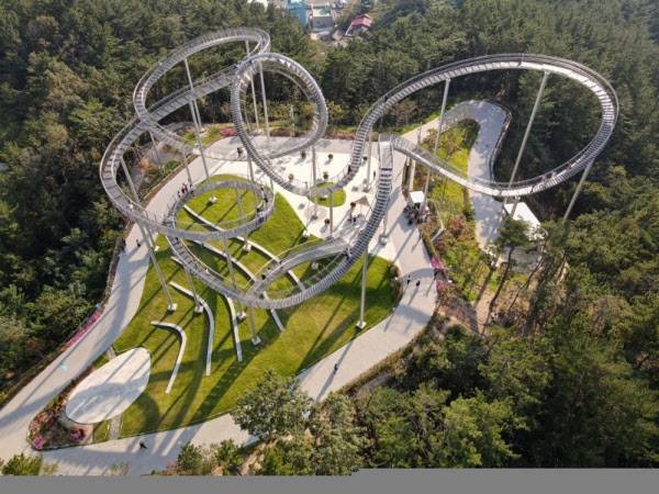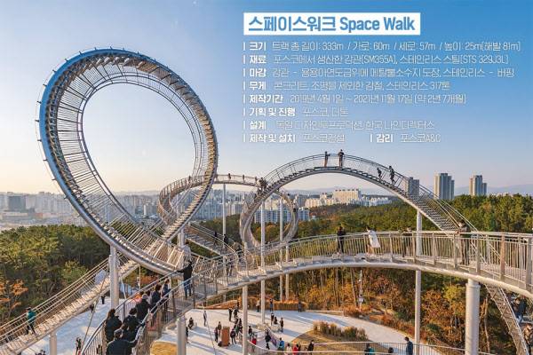 최근 경북 포항시에 있는 롤러코스터를 닮은 랜드마크 건축물이 인기다. 동해 영일만과 맞붙은 환호공원 안에 설치한 ‘스페이스 워크’(Space Walk)가 그 주인공이다. 그동안 포함시에 가 볼만한 관광지가 많지 않았는데, 이 건축물이 생기면서 국내 여행객은 물론 외국인 관광객 발길까지 이어지고 있어 지역 경제를 살리는 효자 역할을 톡톡히 하고 있다.