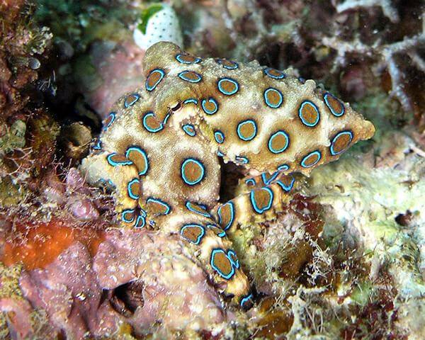 ‘파란고리문어’는 아열대성 문어의 일종이다. 크기는 보통 12cm에서 20cm 사이며, 몸은 노란색인데 검고 파란 고리 무늬를 가지고 있기에 푸른점문어라고도 불린다. 파란고리문어는 몸에 테트로도톡신 성분이 있는데, 이는 복어도 가지고 있는 맹독이다. 파란고리문어의 이빨에는 이 독이 있어서 사냥용으로 쓰이며, 조금 떨어진 표적에 독을 발사할 수도 있다. 최근에는 온난화의 영향으로 우리나라 인근 바다에서 발견되는 경우가 잦아졌으므로 주의해야 하는 동물이다.
