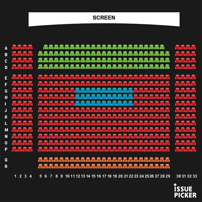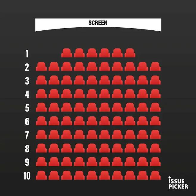 반대로 대형 스크린이 설치된 상영관은 상황이 다르다. 너무 뒤로 가면 화면이 작게 보이고 몰입이 깨진다. 이럴 땐 중간보다 앞줄이 낫다. 화면 높이와 눈높이가 비슷해 편하게 볼 수 있다. 대형 스크린에선 중앙 근처 앞쪽이 황금존이다.