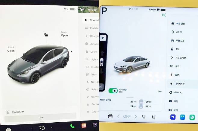 플랫폼 자체의 완성도와 비전은 긍정적인 평가를 받았지만, 문제는 UI 디자인에서 시작됐다. 공개된 플레오스 커넥트의 초기 시연 화면이 테슬라의 인포테인먼트 화면과 구성·색감·아이콘 디자인까지 유사하다는 지적이 줄을 이었다. 실제로 화면 분할 방식, 좌우 기능 바 배치, 심지어 주행 애니메이션 스타일까지 ‘테슬라를 복제했다’는 말이 나올 정도다.