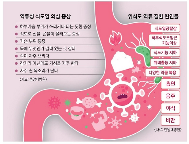 위 안에 있어야 할 위산이나 음식물이 식도로 역류하면서 식도 점막을 자극하고 염증을 일으키는 질병입니다.