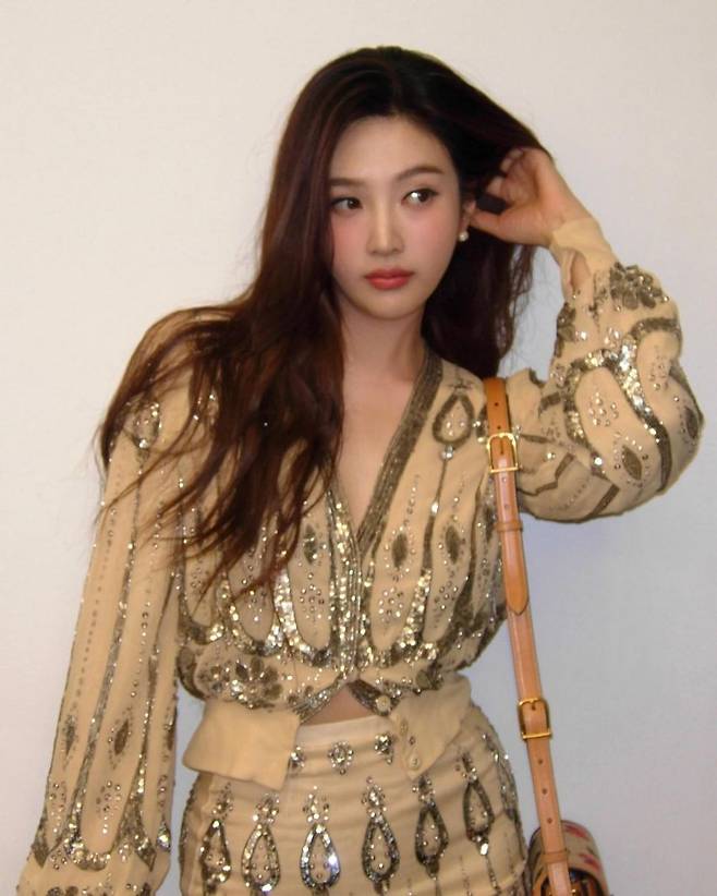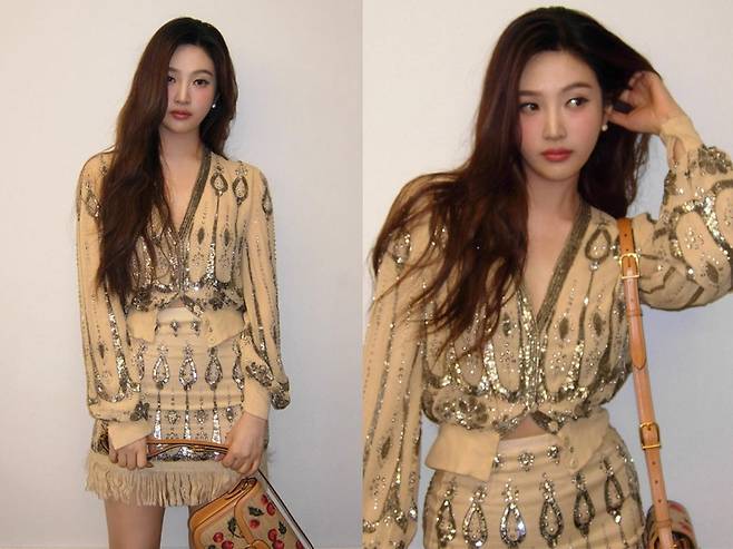 사진 속 조이는 스팽글로 장식된 베이지톤 셋업을 착용하고 있다. 밑단에 술이 달린 쉬폰 재질의 스커트와 넥라인이 브이라인으로 파진 카디건 상의는 빈티지한 디자인으로 완성됐다. 차분한 컬러에 화려한 장식의 의상은 고급스러운 분위기를 자아낸다.
