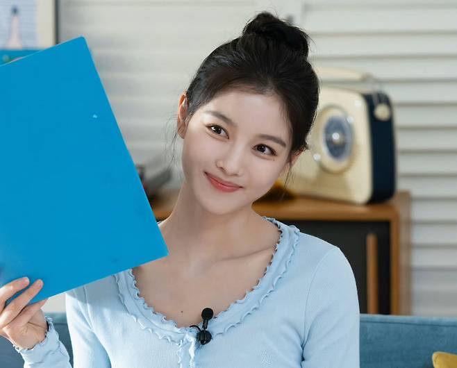은은한 파스텔 톤의 블루 컬러 니트를 선택해 김유정 특유의 맑고 깨끗한 피부 톤을 더욱 돋보이게 연출했어요.