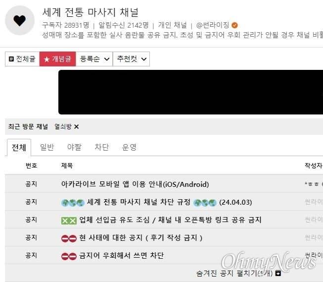 | ▲ 성매매 업소 및 이용 후기 게시물이 올라오는 아카라이브의 '세계 전통 마사지 채널'의 모습. "성매매 장소를 포함한 실사 음란물 공유 금지"라고 밝히고 있으나 관련 게시글이 다수 확인됐다. |