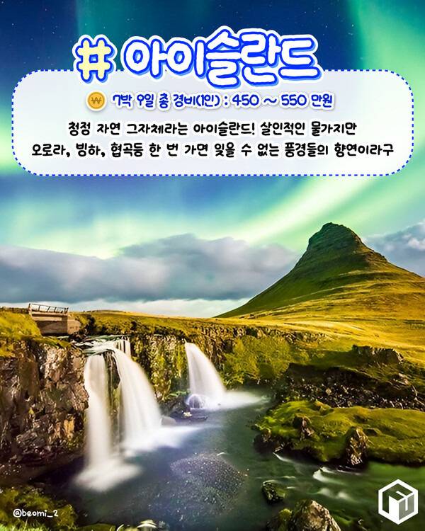 아이슬란드 레이캬비크 - 7박 9일 총 경비(1인) : 450 ~ 550 만원