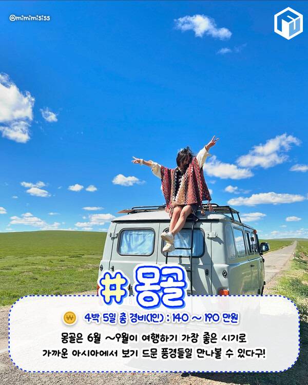 가까운 아시아에서 드넓은 초원과 쏟아지는 별들을 만날 수 있는 몽골입니다. 몽골을 6~9월이 최적의 여행 시기이자 유일한 시기인데요. 몽골은 아직까지 여행 인프라가 잘 갖춰지지않아 자유여행보다는 투어사를 통해 여행하는 편이 좋습니다.