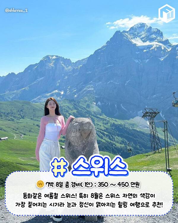 스위스 자연의 정수라 할 수 있는 '인터라켄', 유럽의 지붕이라는 '융프라우' 또 스위스에서 가장 관광객들이 많이 찾는다는 체르마트의 '마테호른'까지 마치 해외여행이 아니라 다른 세상에 온 듯한 비이상적인 세상을 만나볼 수 있기에 8월 해외여행지로 추천드리니다.