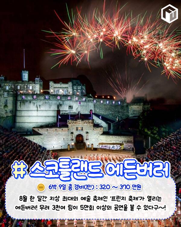 도시 곳곳에서 축제 분위기를 느낄 수 있어 활기찬 에든버러에서는 그 외 에든버러 성, 아써스 씨트, 홀리루드 궁정과 국립박물관등 다채로운 관광지들도 함께 방문하면 좋아 8월 추천드리는 해외여행지입니다.