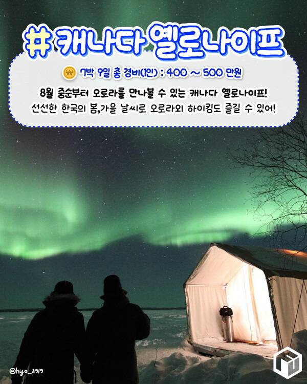 8월 중순부터 신비로운 오로라를 만나볼 수 있는 캐나다 옐로나이프는 여름철 최고 온도가 20도에서 최저 11도로 한 여름이라고는 믿기 힘든 시원하고 쾌적하게 여행을 즐길 수 있는 해외여행지입니다.