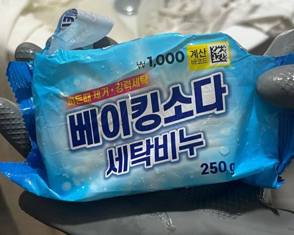 4. 과탄산소다 물에 담가도 지워지지 않는 국소 부위 세탁을 원할 경우, 그 부분만 베이킹파우더 비누로 문지르기
