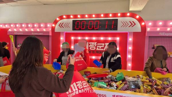 7일 오후 서울 성동구 성수역 지하철 3번 출구 앞에 마련된 알리익스프레스 팝업스토어 현장은 ‘11초 장바구니 챌린지’에 참여하려는 방문객들로 북적였다. 참가자들은 각기 다른 크기의 바구니를 들고 제한시간 11초 안에 라면, 화장품, 건강기능식품 등을 가능한 한 많이 담기 위해 빠르게 손을 움직였다. 짧은 시간에 집중하는 이들의 모습은 게임을 하는 듯 역동적이었고 도전이 끝난 뒤에는 웃음과 환호가 이어지며 현장이 활기를 띠었다.